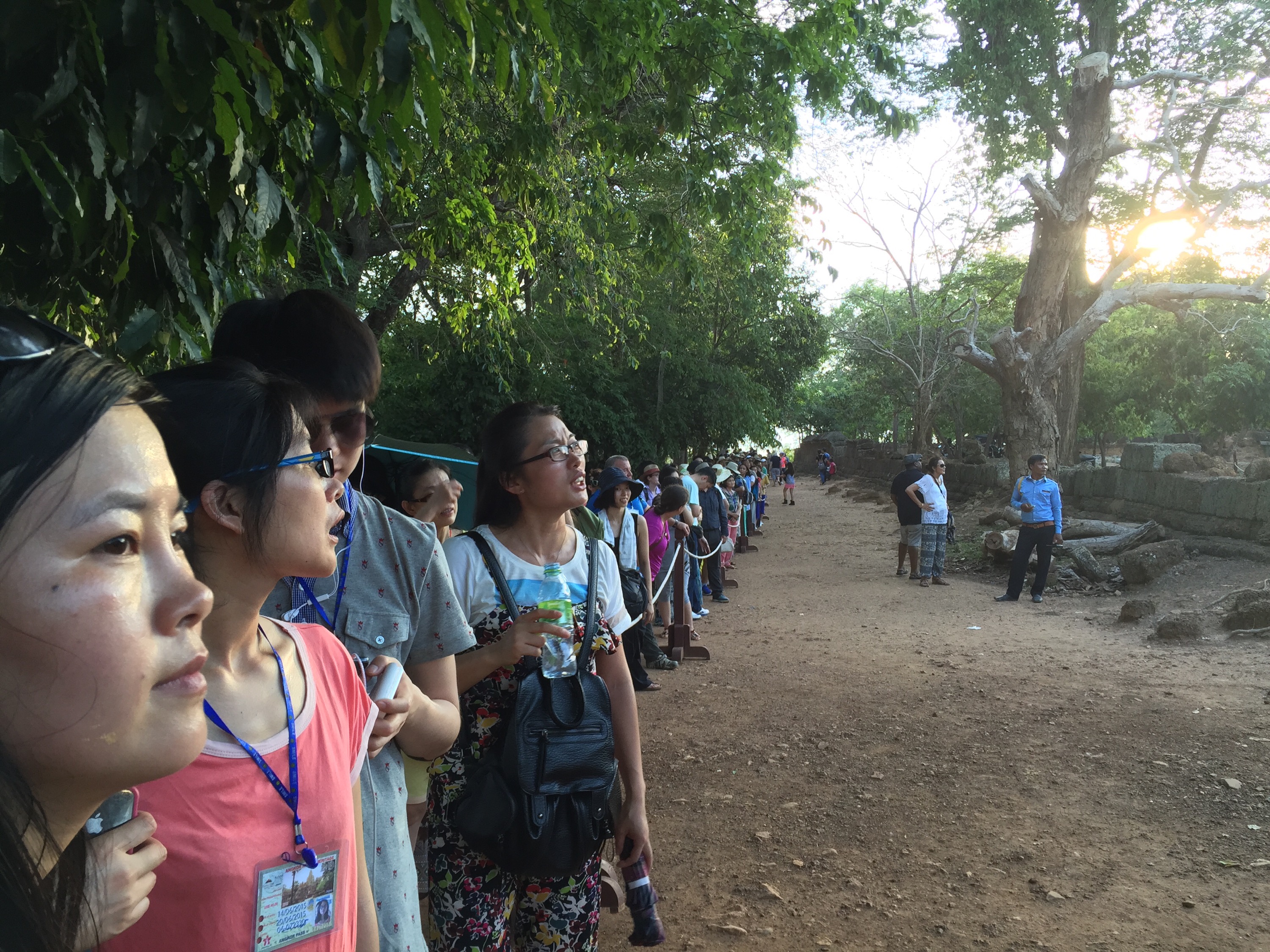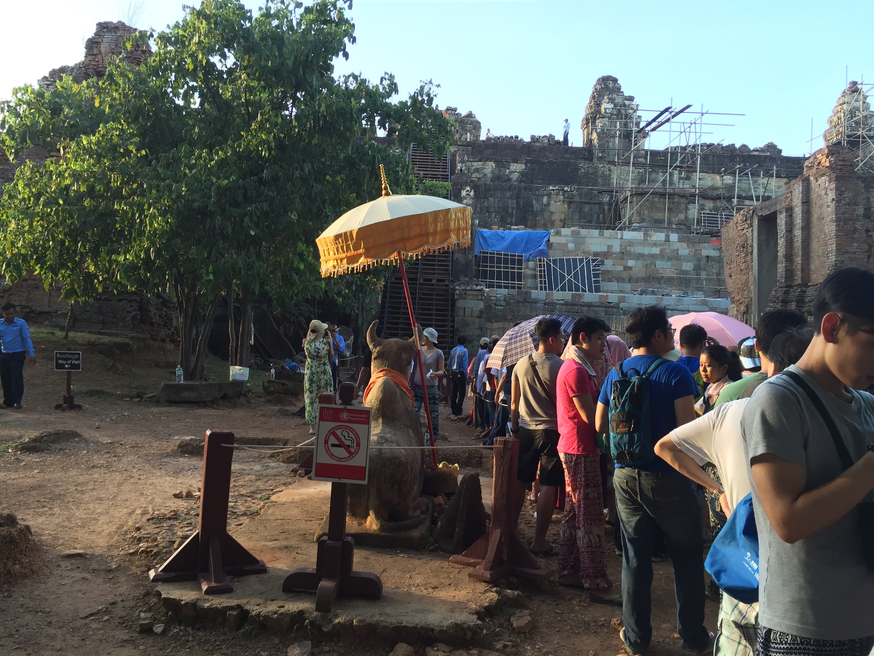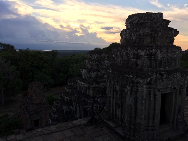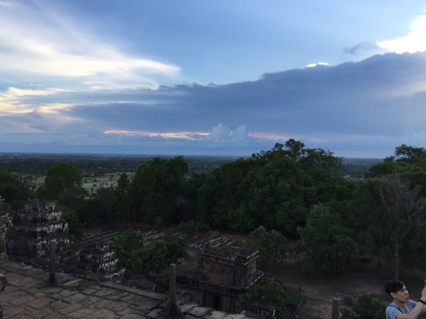 This is the place to be for sunset if you are visiting the Angkor Wat area. I did the climb up the mountain to find a rather long line. Which I waited in for about an hour or so. As I was waiting, I found out that they only allow 300 people to go up to the top of the temple at a time. So it was a bit of a nail biter for me. I wasn’t sure if I would be one of the lucky ones. At around 6:05, the line really started moving, and lo and behold, I was able to climb the many stairs to reach the ultimate sunset viewing spot. Now, the only problem was clouds! It was to cloudy to see a sunset but a beautiful experience nonetheless.