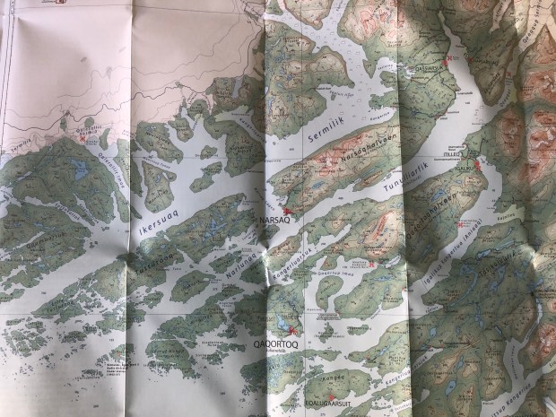 But first, some orientation on the map. We are leaving Narsaq and are heading to the Qalerallit camp. The first map picture is the wide view which includes Qassiarsuk and the second map view is a closer look at the area from Narsaq to the glacier front and camp.