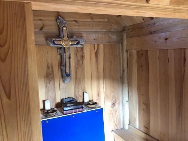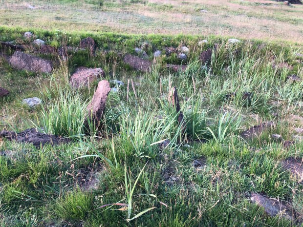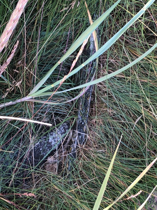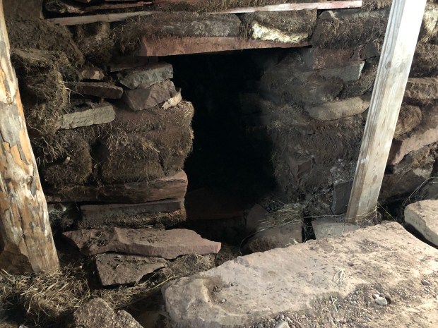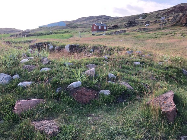 Erik the Red’s house spotBased on the stones, you can tell this was a place for cattle. The Vikings kept livestock in their homes in separate rooms.Cattle separating stonesDifficult to see but a fossilized (?) cow boneJara showing us the replica of the first church